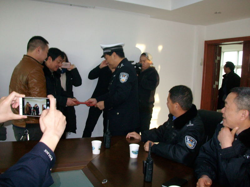 后經(jīng)交警事故處理大隊多方查找見義勇為的的哥,才知道是出租汽車公司的兩名的哥。于是便有了交警支隊長上門表彰的哥的一幕。