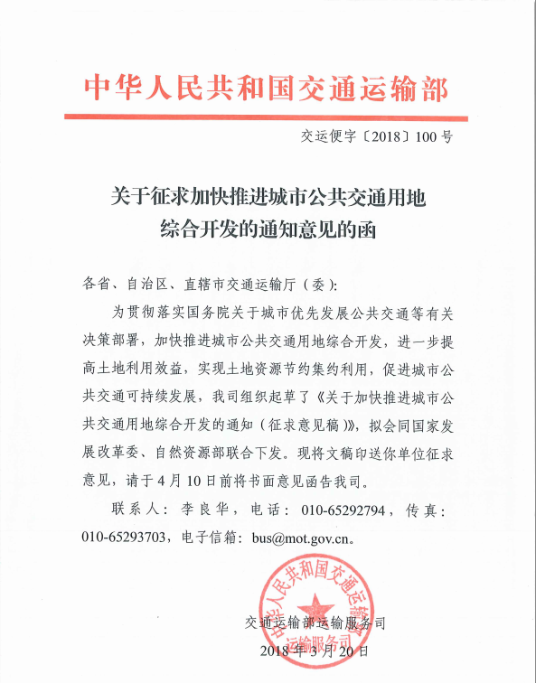關(guān)于征求加快推進(jìn)城市公共交通用地綜合開(kāi)發(fā)的通知意見(jiàn)的函