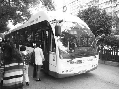 昨日,記者來到卓刀泉南路方家嘴公交車站,這里是596路的起點站。15分鐘后,一輛漂亮的新能源白色公交車開進了站點(如右圖)。這輛公交車外觀和普通公交明顯不同,車身以白色為主,前車窗占整個車頭前面的一半,車廂兩側(cè)的車窗也占車身高度的一半,從外觀上看,比普通公交車要大得多。