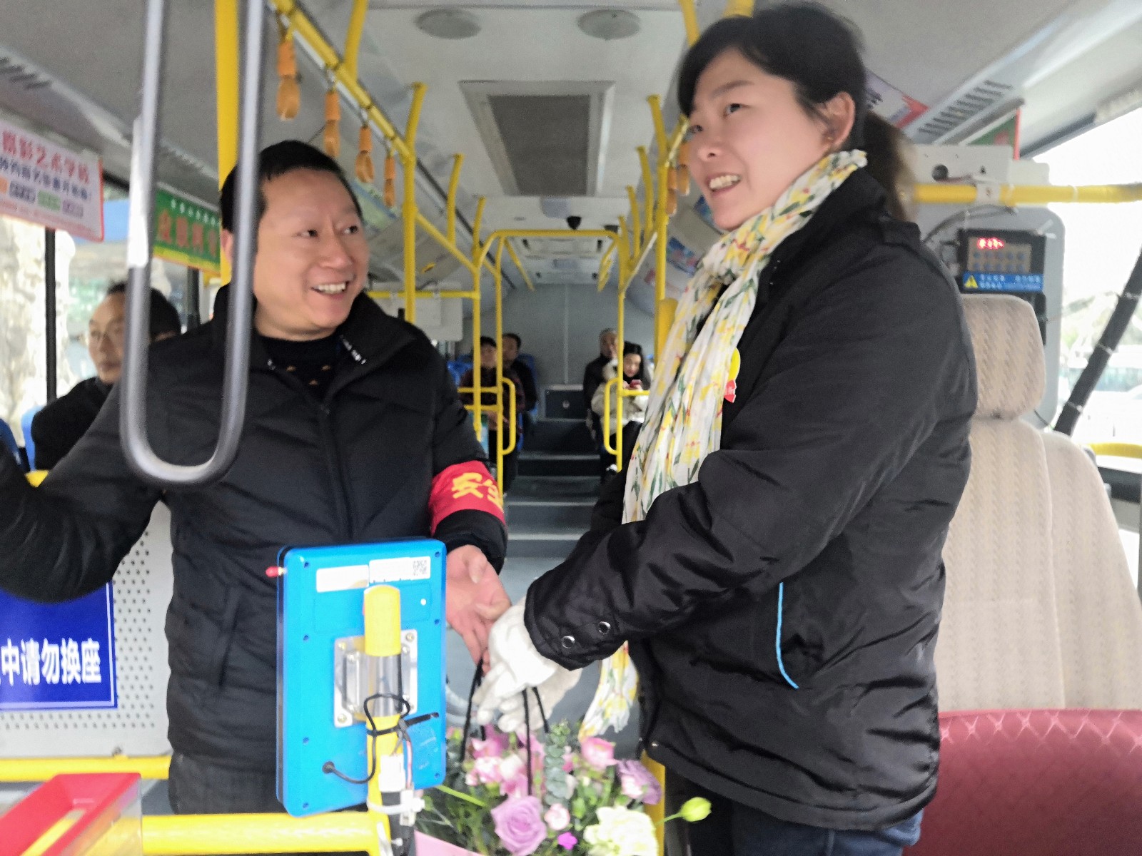“我代表公司全體男職工,祝你們節(jié)日快樂(lè),永遠(yuǎn)美麗??!這籃鮮花送給你~”公交信息技術(shù)部男職工羅皓這樣說(shuō)道,并將一籃鮮花送到正在跑班的公交女駕駛員蘇純菊手中。面對(duì)這突來(lái)的鮮花和祝福,蘇純菊滿(mǎn)臉驚喜和溫馨,“謝謝,謝謝你們”在道謝聲中,關(guān)上車(chē)門(mén),微笑著駛向下一站。