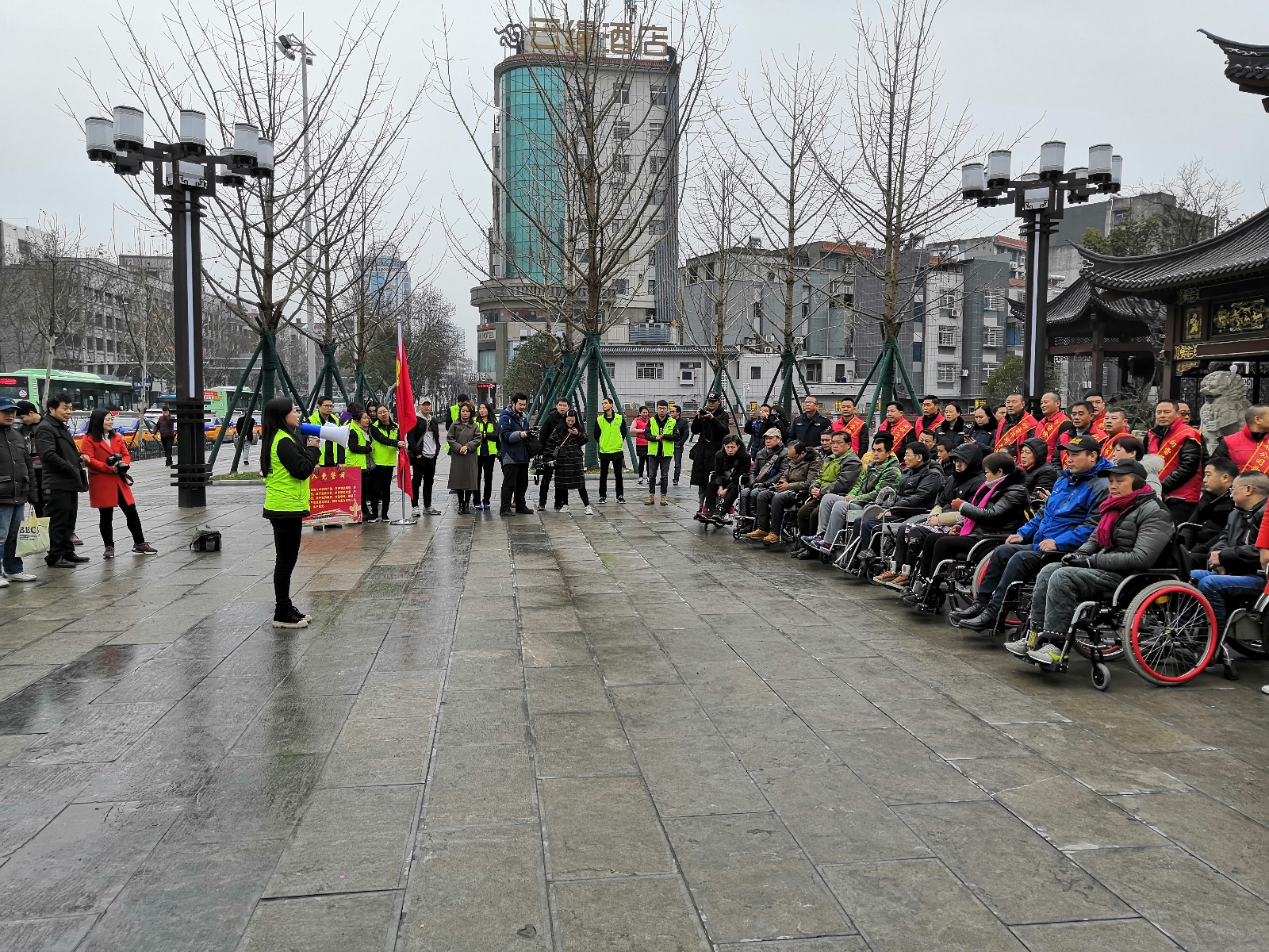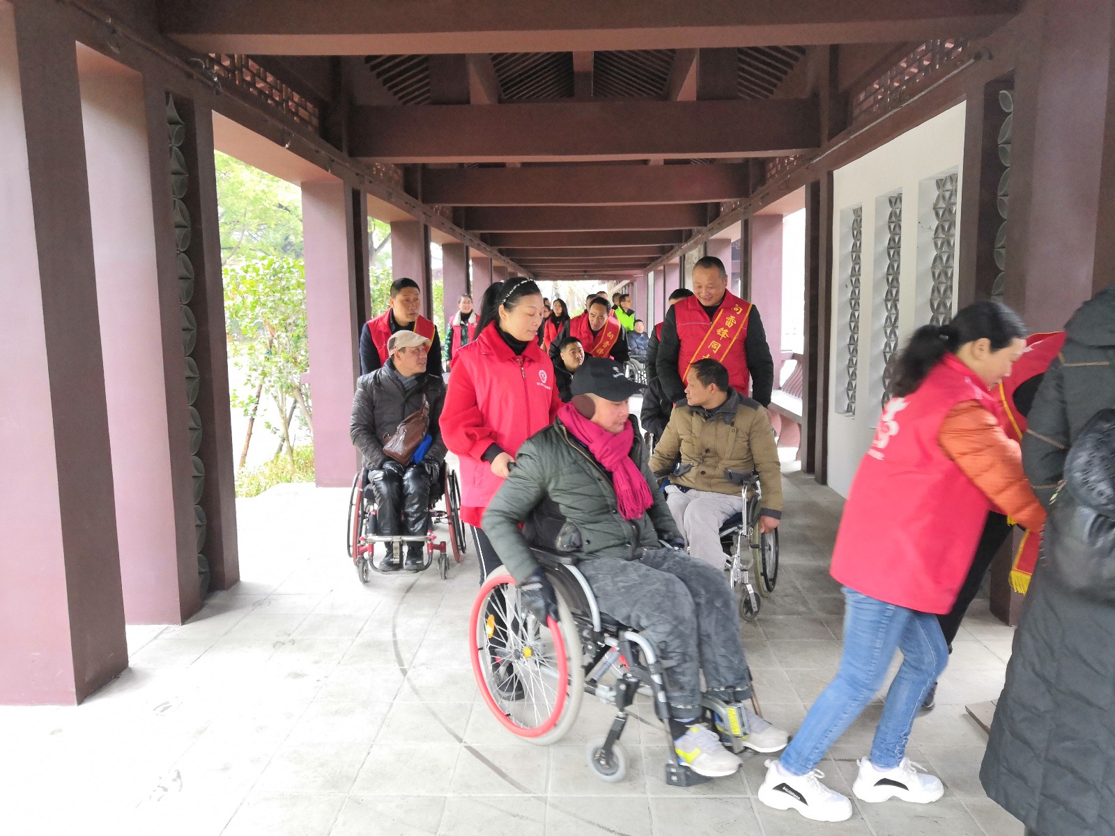 龍泉公園長廊,在公園導游的介紹下,殘疾朋友及隨行的志愿者們更清楚的知道了龍泉公園的建園歷史和荊門故事。