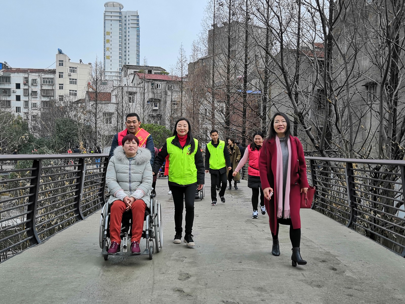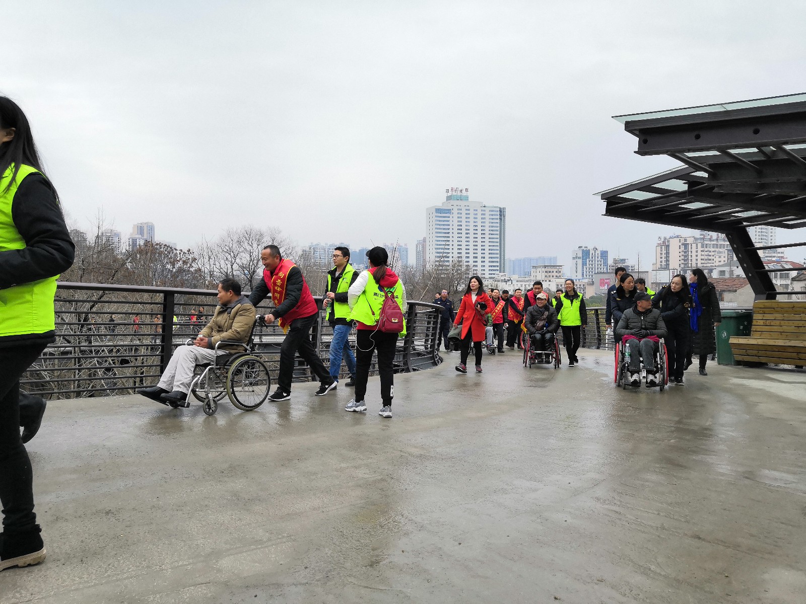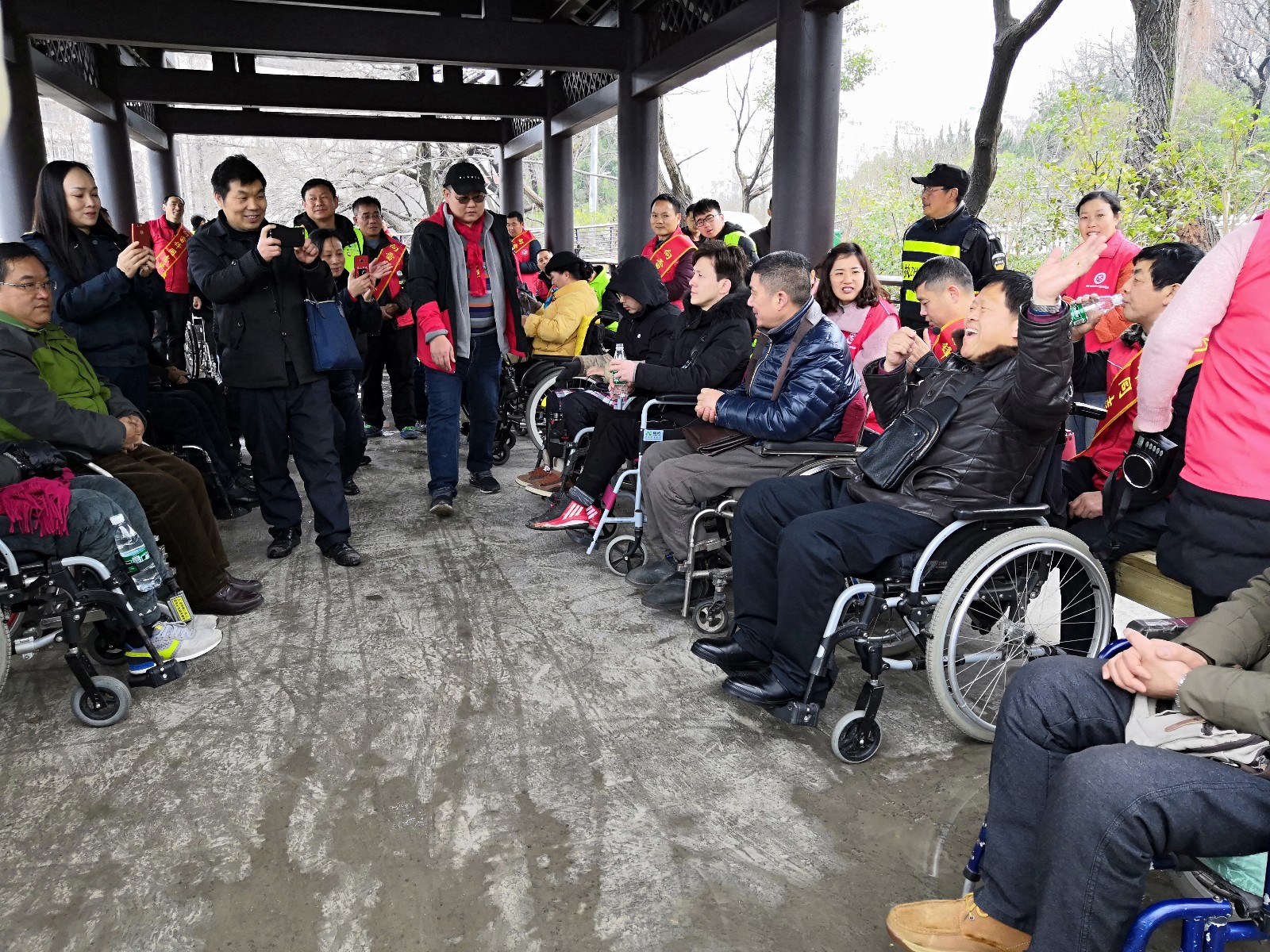 在公園新修建的盤山橋上,志愿者們推行著輪椅,與殘疾朋友以新的視角欣賞著山園美景,一路上歡歌笑語。在涼亭里大家輪流著唱歌助興,敞開心扉,訴說著心中的故事。