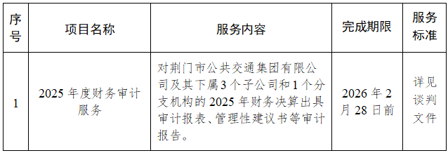 二、項目名稱:荊門市公共交通集團有限公司2025年度財務(wù)審計服務(wù)項目